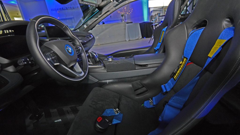 Ξεγυμνωμένο και με πιο αγωνιστικό σασί το υπέρ-ελαφρύ υβριδικό διαστημόπλοιο BMW i8 καλείται να διαδραματίσει τον ρόλο του αυτοκινήτου ασφαλείας στους αγώνες Formula E. Πιο σκληρές αναρτήσεις, μπόλικο ανθρακόνημα, rollbar, καθίσματα κατηγορίας φτερού σε ότι αφορά το βάρος, φρένα ανθρακόνημα-κεραμικά και ασύρματη φόρτιση με το σύστημα Qualcomm Halo Prototype Technology.
