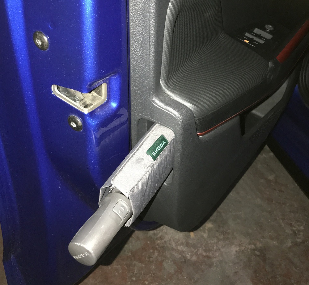 Στον…κρυφό εξοπλισμό ανήκει και η παραδοσιακή, τοποθετημένη στο κάτω μέρος της πόρτας, ομπρέλα της SKODA. Γενικότερα ο εξοπλισμός ασφάλειας και άνεσης, είναι πληρέστατος.