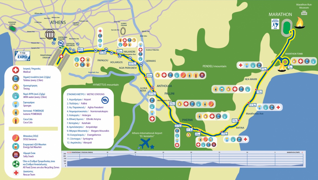 Εκκίνηση: Μαραθώνας – Λ. Μαραθώνος – είσοδος στον Τύμβο (αριστερό ρεύμα) – έξοδος από Τύμβο (δεξιό ρεύμα) – Λ. Μαραθώνος – ανισόπεδος κόμβος Σταυρού – Λ. Μεσογείων – Μιχαλακοπούλου – Φειδιππίδου – κόμβος Κηφισίας/Αλεξάνδρας – Λ. Βασ. Σοφίας – Ηρώδου Αττικού – Παναθηναϊκό Στάδιο.