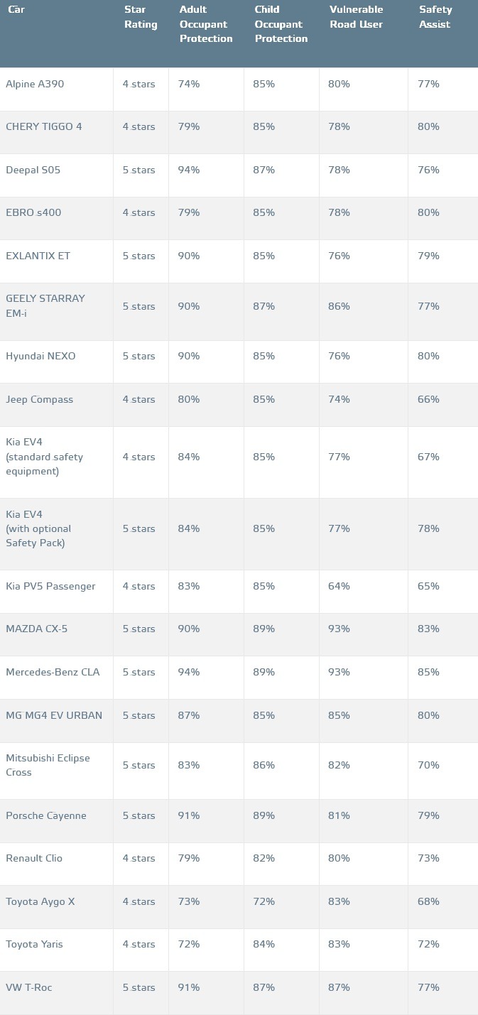 Άλλα οχήματα που αξιολογήθηκαν στην τελική παρτίδα δοκιμών που πραγματοποίησε ο Euro NCAP ήταν τα EXLANTIX ET, GEELY Strarray EM-i, MG MG4 EV Urban που πήραν 5 αστέρια και τα CHERY Tiggo 4, EBRO s400, MITSUBISHI Eclipse Cross και RENAULT Clio που βαθμολογήθηκαν με 4 αστέρια.