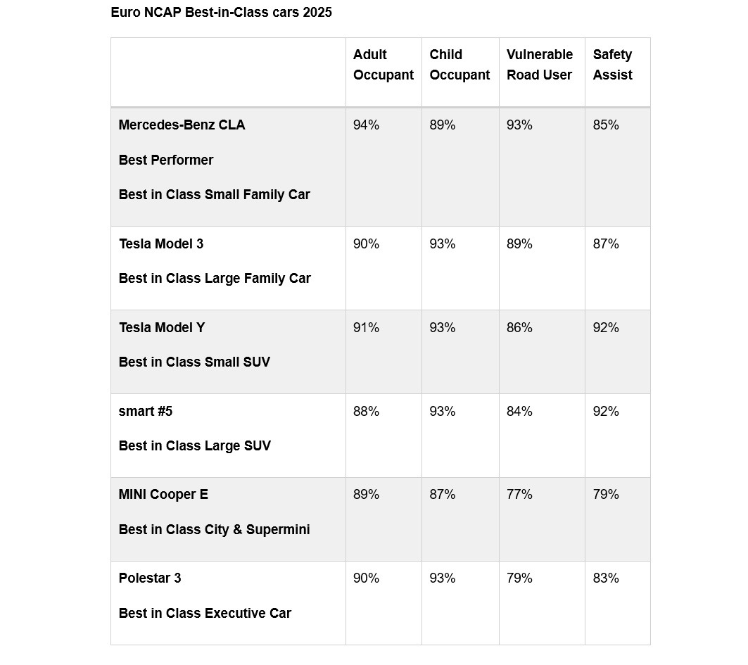 Ο Euro NCAP αποκάλυψε τα ασφαλέστερα αυτοκίνητα στην κατηγορία τους, που δοκιμάστηκαν το 2025, με τη MERCEDES-BENZ CLA να συγκεντρώνει την υψηλότερη βαθμολογία και αρκετά ηλεκτρικά μοντέλα να εντυπωσιάζουν.