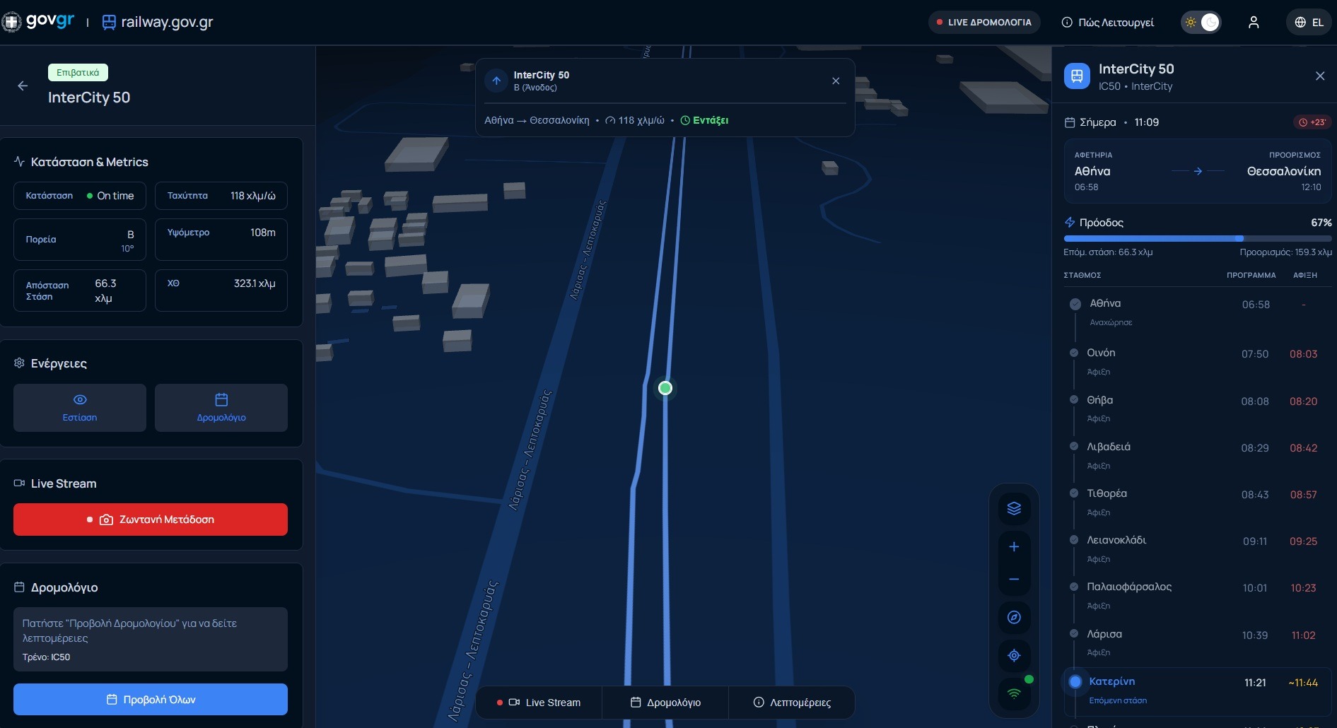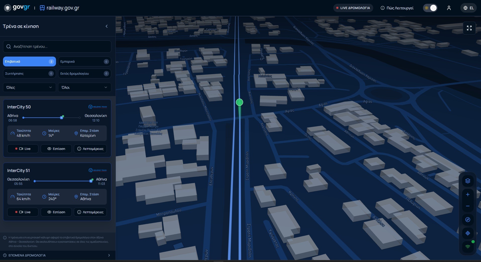 Μέσα από το railway.gov.gr μπορούμε να βλέπουμε: τη ζωντανή θέση των τρένων στον χάρτη, την ταχύτητα και την κατεύθυνσή τους, εκτιμώμενους χρόνους άφιξης, ενημέρωση για καθυστερήσεις και συνολική εικόνα της κυκλοφορίας.