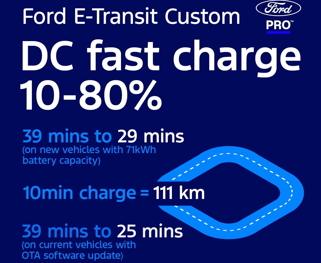 Ως γνωστό οι ασύρματες ενημερώσεις (OTA) αποτελούν βασική λειτουργία του οικοσυστήματος FORD Pro και, σε αυτή την περίπτωση, επιτρέπουν την αναβάθμιση της γρήγορης φόρτισης DC για τα E-Transit Custom που ήδη κυκλοφορούν. Έτσι, ο χρόνος φόρτισης από 10% έως 80% για την μπαταρία των 64 kWh (ωφέλιμη χωρητικότητα) θα μειωθεί κατά περίπου 14 λεπτά, φτάνοντας περίπου στα 25 λεπτά. Όλα αυτά θα διευκολύνουν τόσο τις επιχειρήσεις όσο και τους μικρότερους εμπόρους που χρειάζονται να αξιοποιούν κάθε λεπτό της εργάσιμης ημέρας τους.